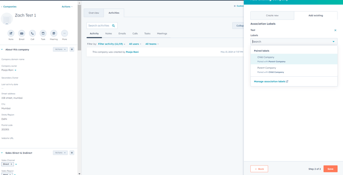 Click on "+Add association label" link and pick either Child company or Parent Company from the dropdown.