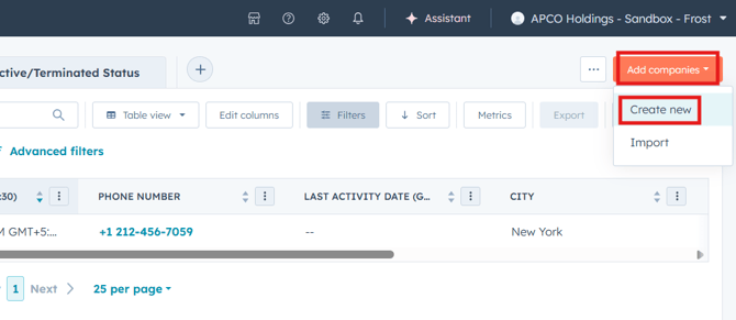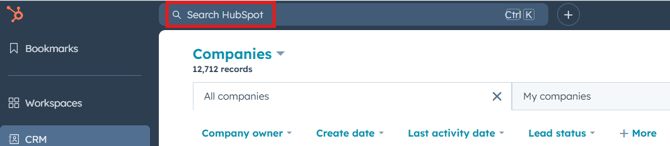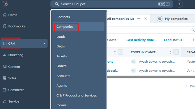 In your HubSpot account, navigate to CRM > Companies from the left sidebar navigation in HubSpot.