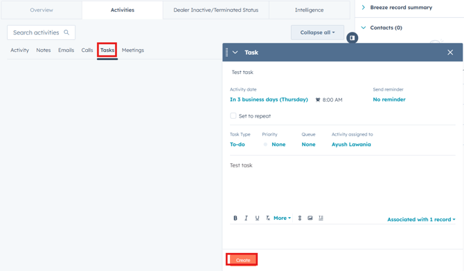 A lot of Tasks will be automatically assigned to you, but you can set your own by clicking the "Create Task" button which prompts you to schedule a time to send an email, call, or just check on the record or assign it to a Queue, if necessary.