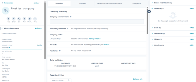 Activities are organized in the central section of the record's page, displaying all activities initially. You can further explore specific activities by clicking on tabs such as Notes, Emails, Calls, Tasks, and Meetings. To get a quick overview of recent activities and deals related to a company, click on the "Overview" tab at the top of the page.