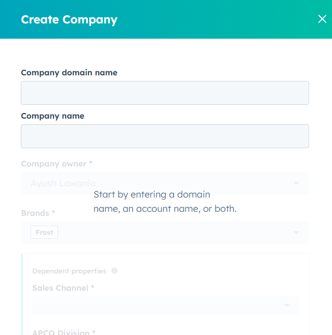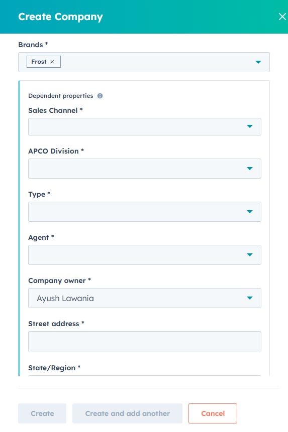 In the "Company Name" field, enter the name. Once entered, additional fields will become available. "Brand" will default to "Frost" Selecting this will display all related fields in the form.