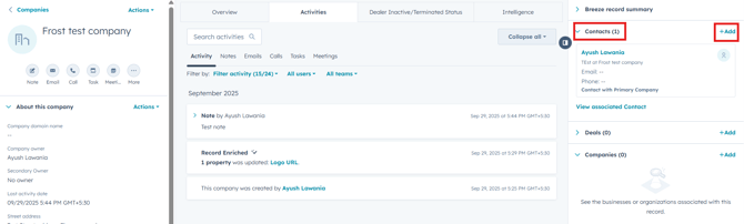 Clicking "+Add" under one of these sections prompts you to either create a New Associated Record or Add the Company's Association to an Existing Record.
