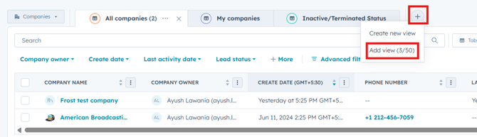 Go to CRM> Companies and click on “+(Plus)” icon and select Add View.