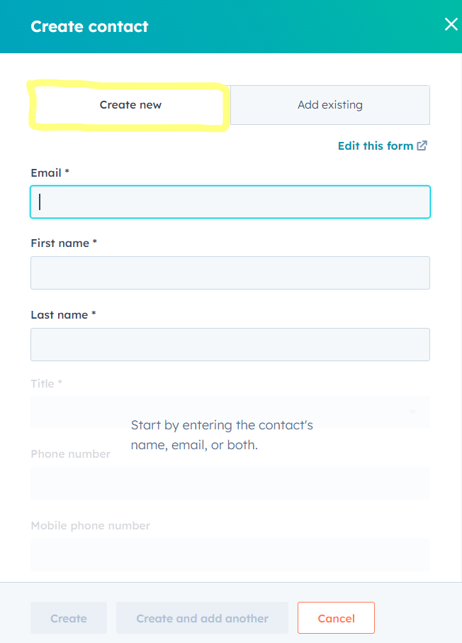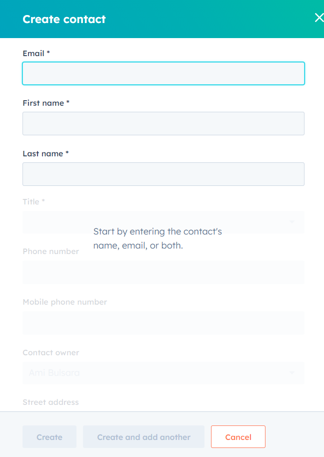 - Click on "Create" to finish creating the contact or click on "Create and add another" to add another contact information.