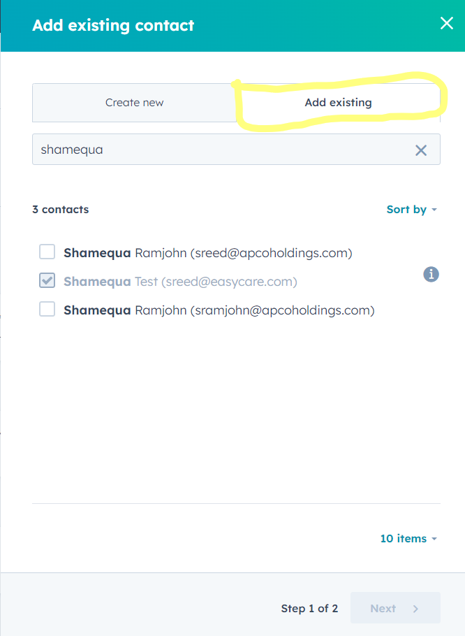 - If you already have a contact in HubSpot that you want to link to a company, simply click on "Add Existing", then, enter the contact's name and select it from the list.