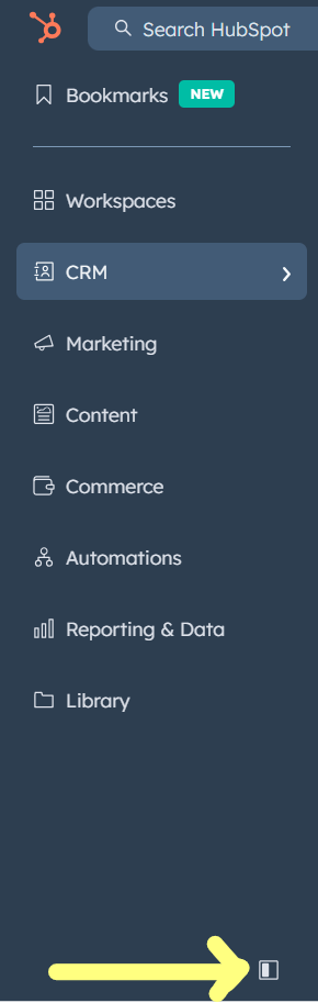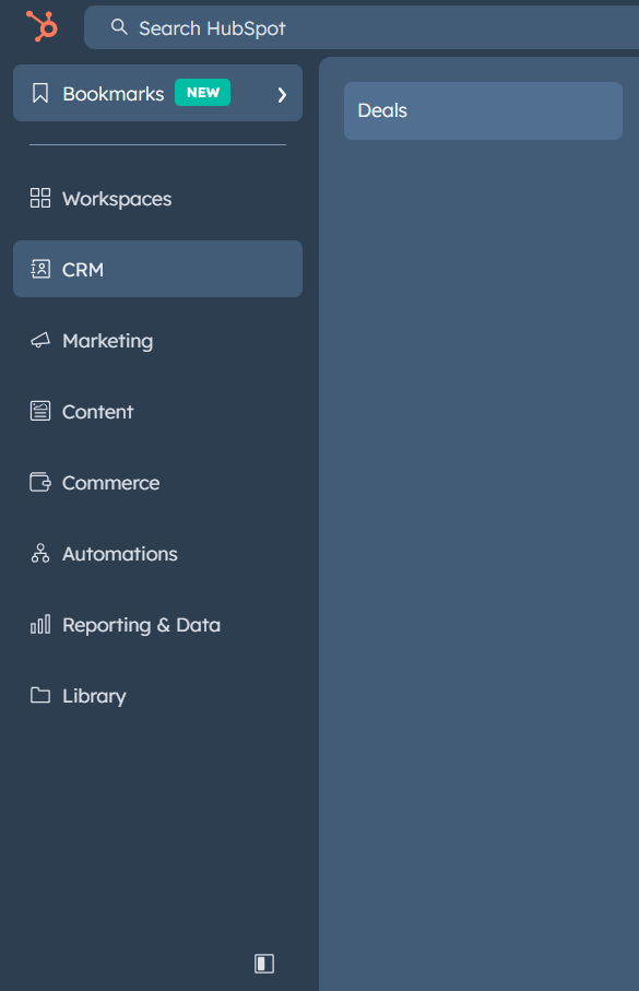 - CRM: Home page and tools related to records, interactions, and payments. Click this menu to navigate to records (contacts, companies, deals, tickets, custom objects), target accounts (found within the Companies page), lists, inbox, calls, and tasks.