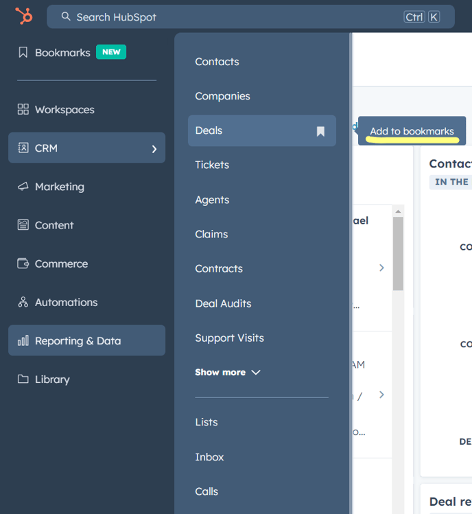 - To remove a bookmark, hover over the menu item and click the bookmark icon in the main menu or in the Bookmarks section.
