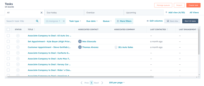 Once you've clicked on one of these objects, you'll be taken to a page with a listing view for that particular object, e.g. clicking on CRM -> Tasks shows "All", "Due today", "Overdue", "Upcoming" tabs so you can focus on what you need more efficiently.