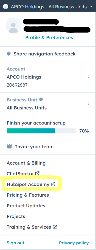- Account: Click the dropdown menu to access options for account details and services. This menu includes Profile & Preferences, your account Hub ID, Account & Billing, HubSpot Academy, Pricing & Features, Product Updates, Projects, and Training & Services. At the bottom of the dropdown menu, you will find the Sign out option and Privacy policy link.