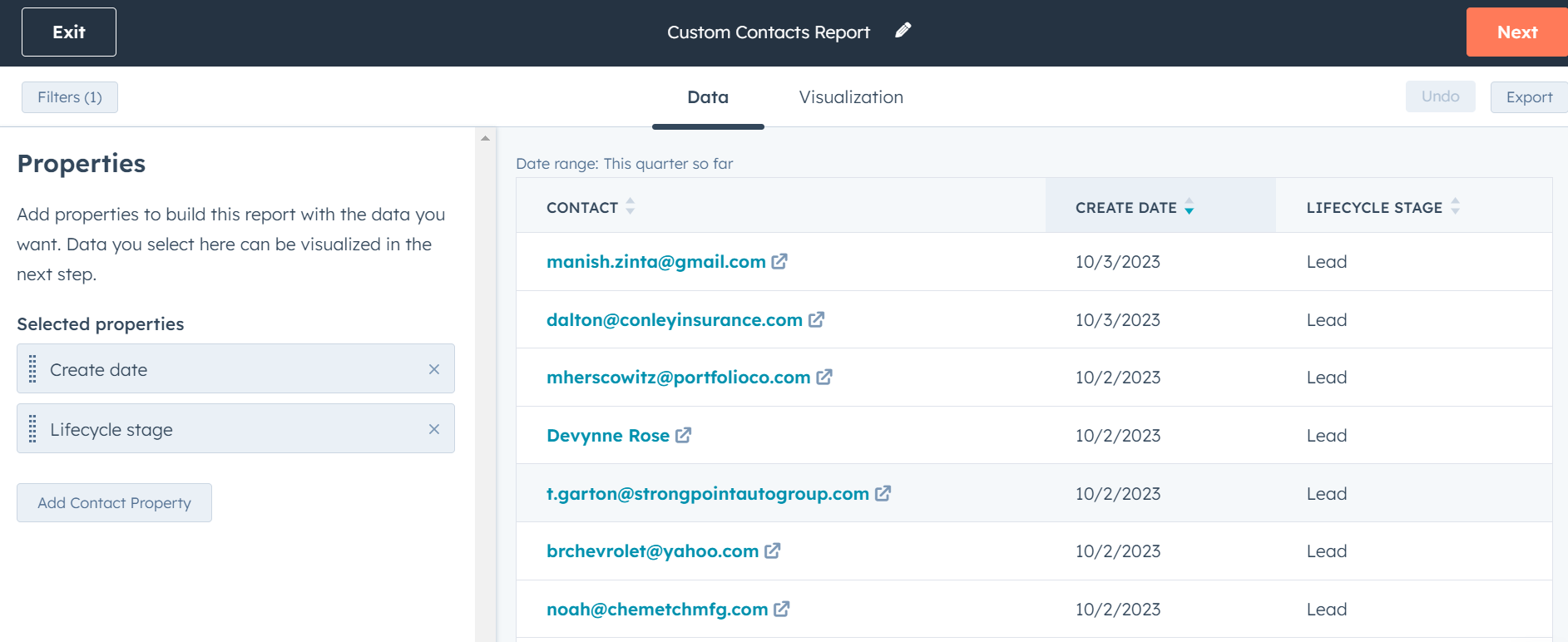 By clicking the "Data" tab over the top of the Report preview, the left panel switches to show which Properties (or Fields) you've selected, what order they are in, and a button to "Add __ Property", which opens both a full list of Properties for the Object(s) in your Report and a search bar to jump right to the valuable data metric your Report needs.